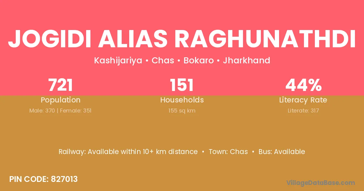 Jogidi Alias Raghunathdi village has a total population of 721 people, of which 370 are males and 351 are females.