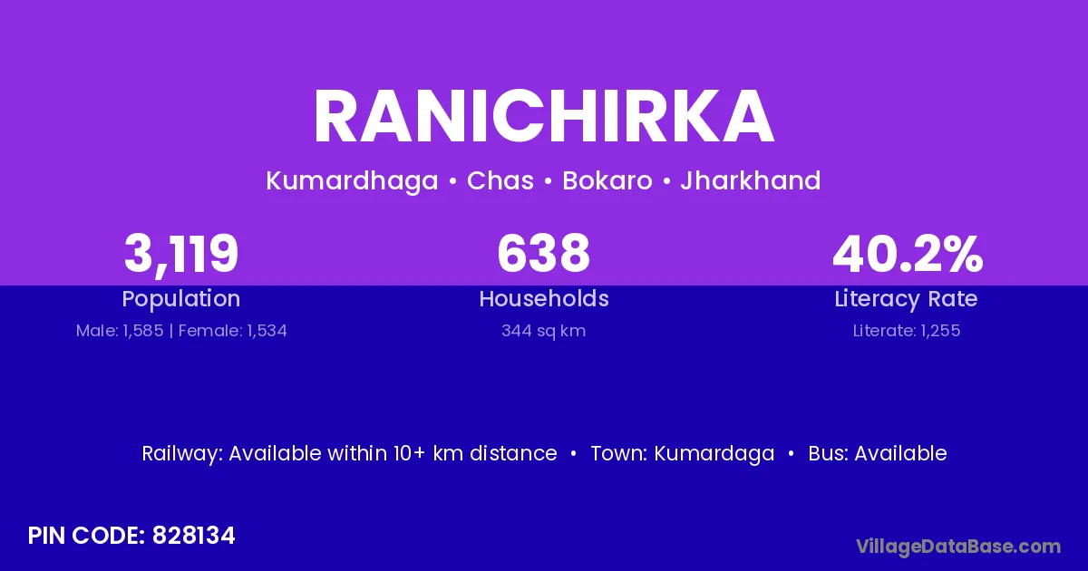 Ranichirka village has a total population of 3,119 people, of which 1,585 are males and 1,534 are females.