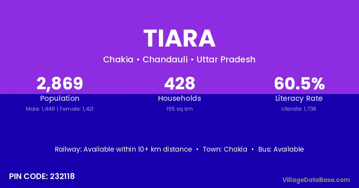 The literacy rate of Tiara village is 55.88%. Male literacy stands at 69.57% and female literacy at 41.58%.