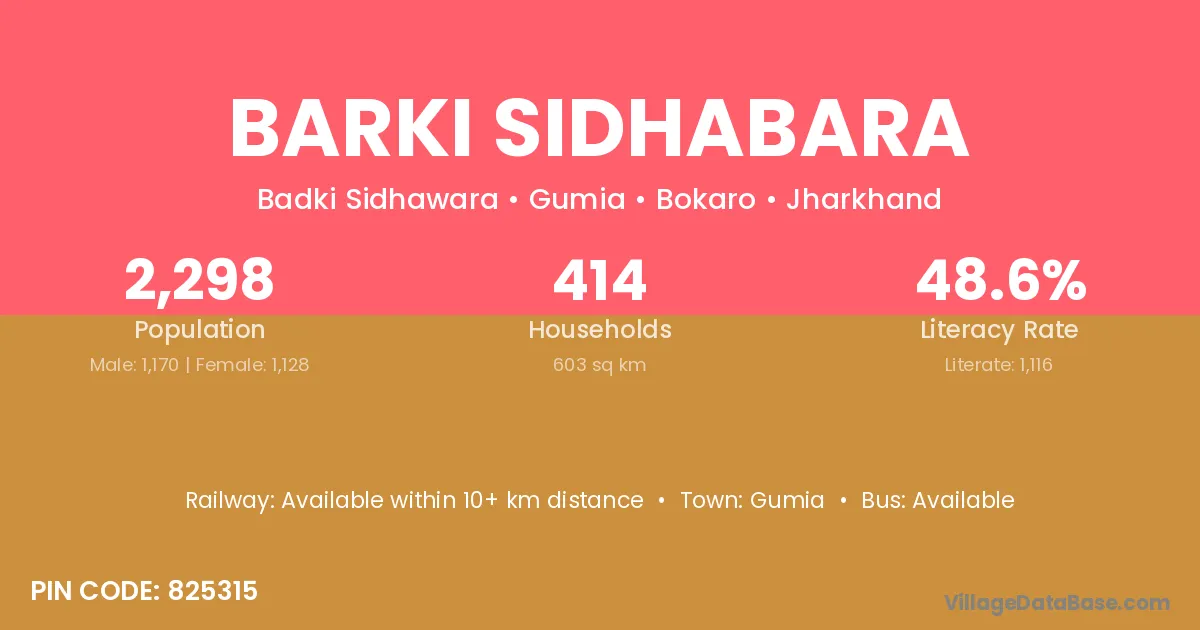 Barki Sidhabara village has a total population of 2,298 people, of which 1,170 are males and 1,128 are females.