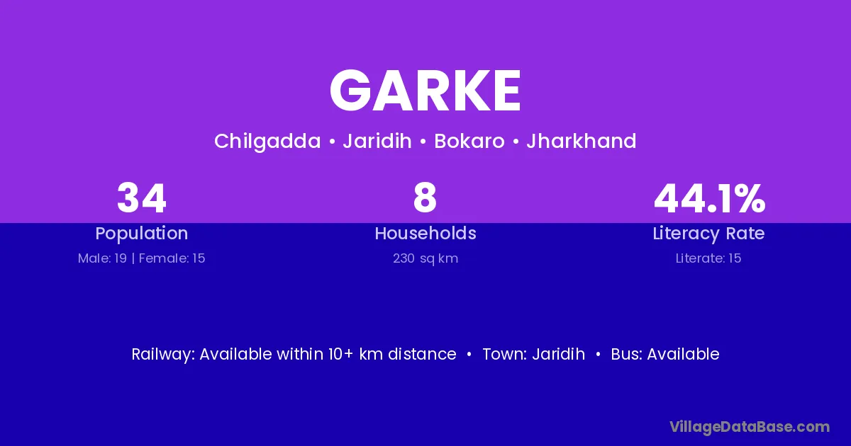 Garke village has a total population of 34 people, of which 19 are males and 15 are females.