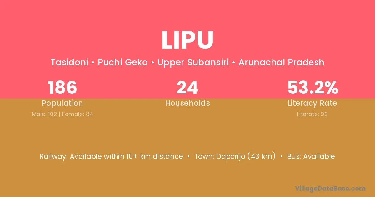 The literacy rate of Lipu village is 48.75%. Male literacy stands at 62.75% and female literacy at 34.98%.
