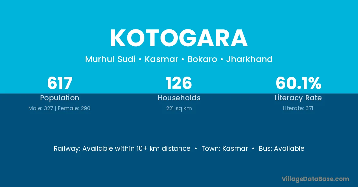 Kotogara village has a total population of 617 people, of which 327 are males and 290 are females.