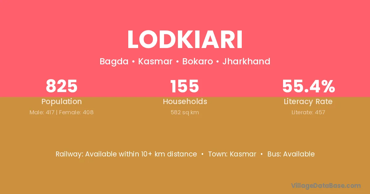 Lodkiari village has a total population of 825 people, of which 417 are males and 408 are females.