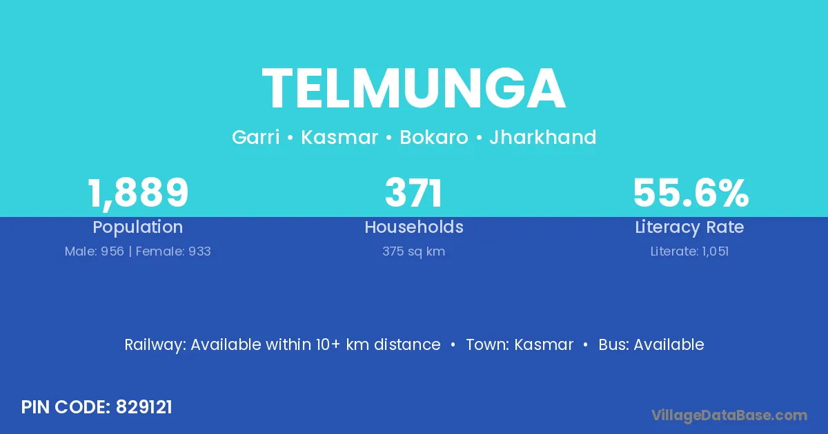 Telmunga village has a total population of 1,889 people, of which 956 are males and 933 are females.