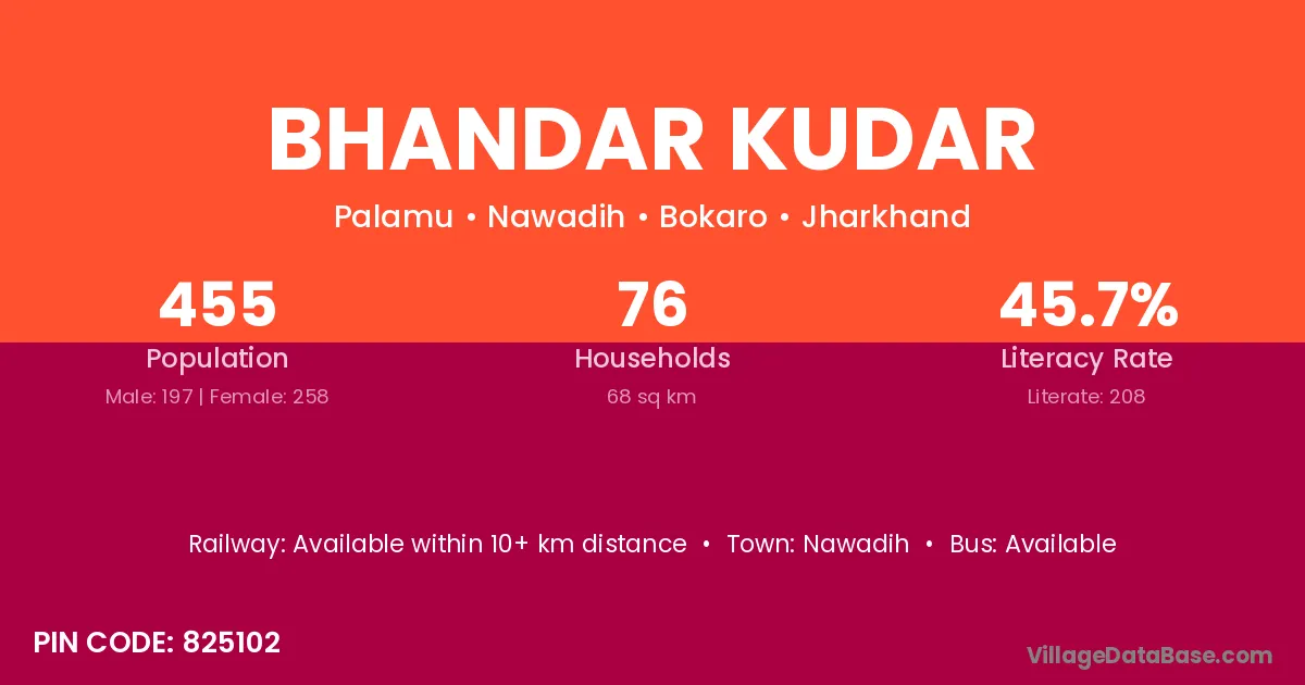 Bhandar Kudar village has a total population of 455 people, of which 197 are males and 258 are females.
