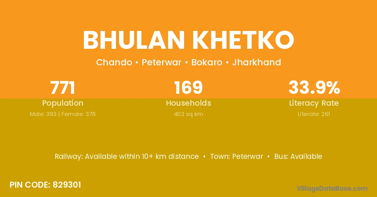 Bhulan Khetko village has a total population of 771 people, of which 393 are males and 378 are females.
