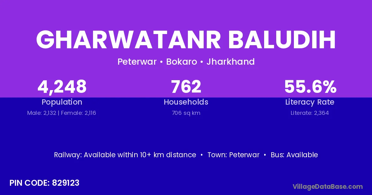 Gharwatanr Baludih village has a total population of 4,248 people, of which 2,132 are males and 2,116 are females.