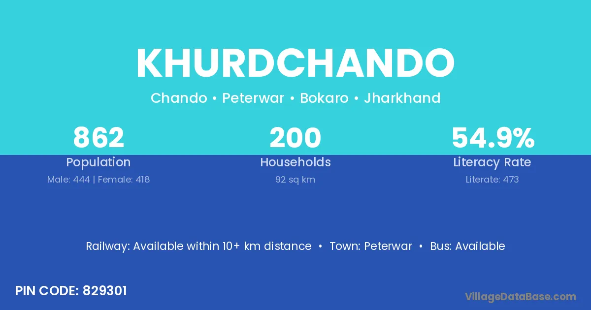 Khurdchando village has a total population of 862 people, of which 444 are males and 418 are females.