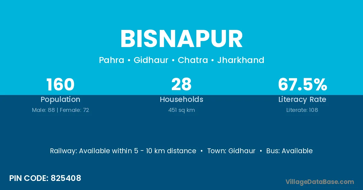 Bisnapur village has a total population of 160 people, of which 88 are males and 72 are females.