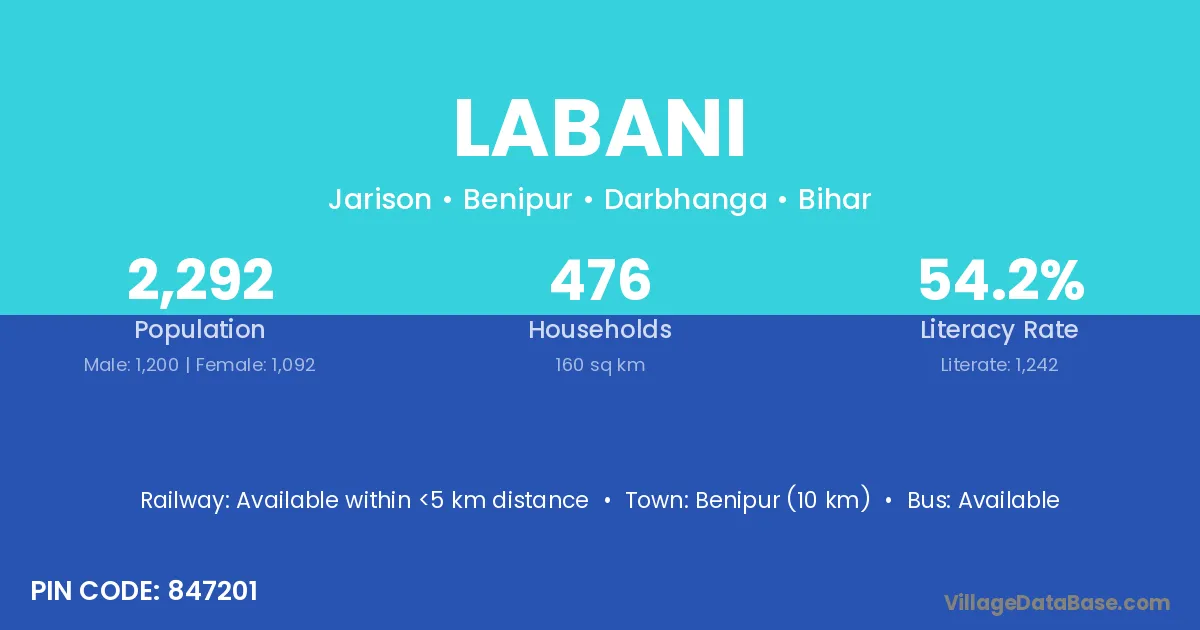 The literacy rate of Labani village is 42.86%. Male literacy stands at 75.00% and female literacy at 0.00%.
