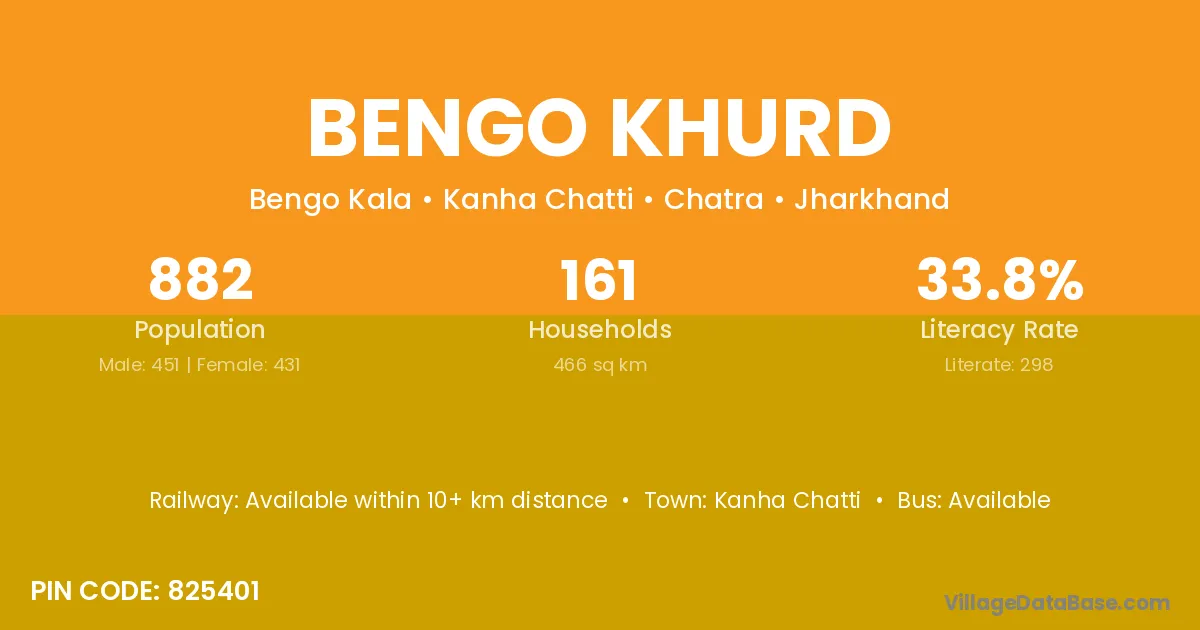 Bengo Khurd village has a total population of 882 people, of which 451 are males and 431 are females.