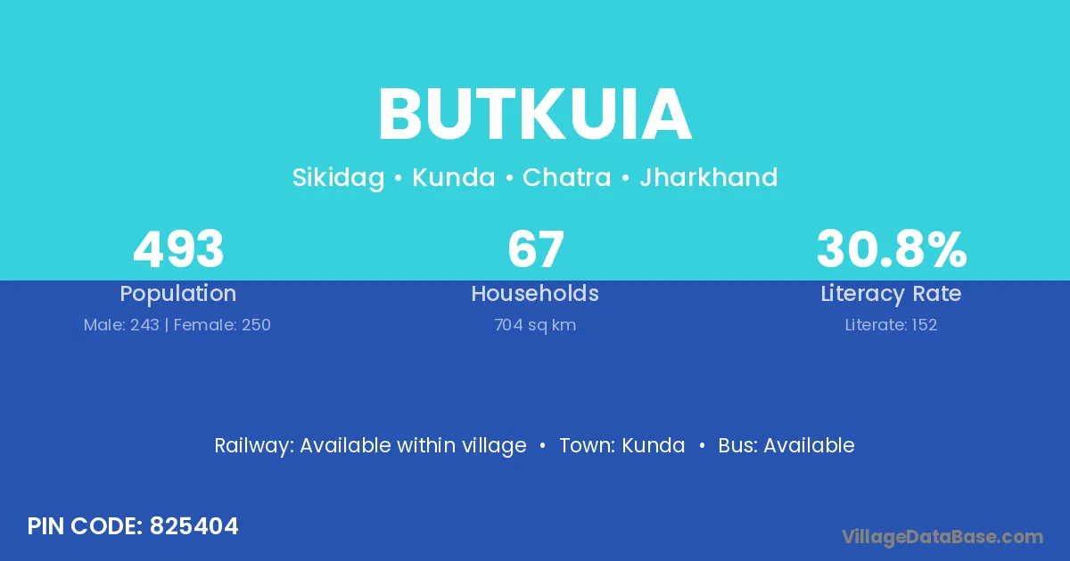Butkuia village has a total population of 493 people, of which 243 are males and 250 are females.