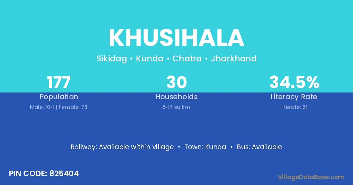 Khusihala village has a total population of 177 people, of which 104 are males and 73 are females.