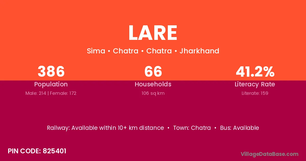 Lare village has a total population of 42 people, of which 20 are males and 22 are females.
