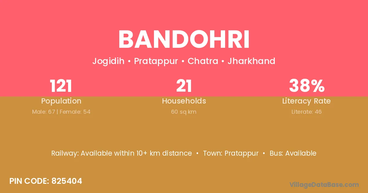 Bandohri village has a total population of 121 people, of which 67 are males and 54 are females.