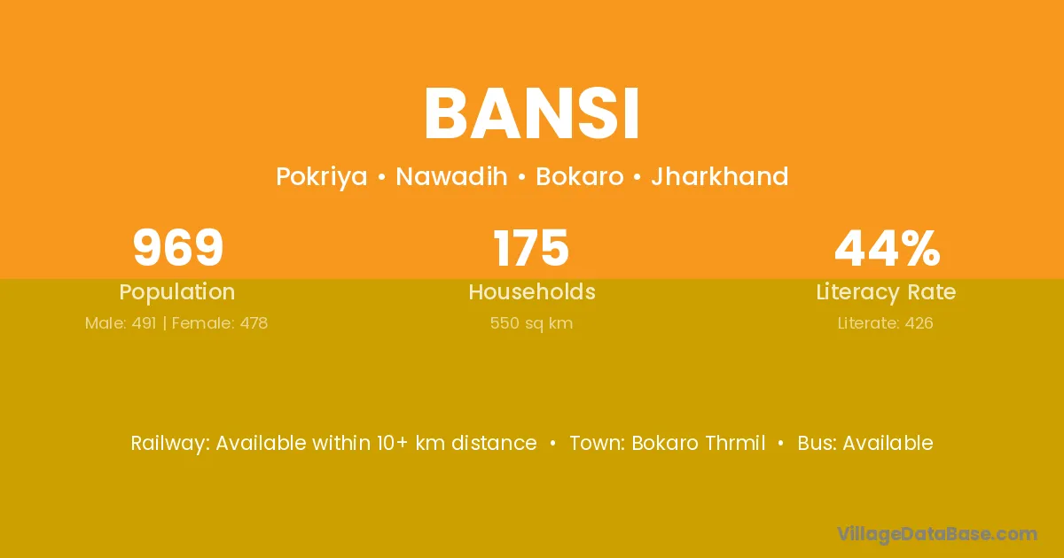 The literacy rate of Bansi village is 47.34%. Male literacy stands at 59.88% and female literacy at 35.09%.