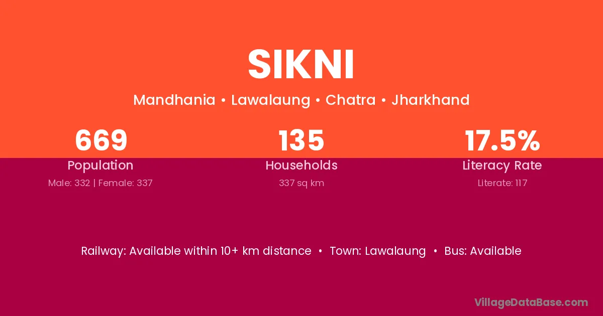 The literacy rate of Sikni village is 34.25%. Male literacy stands at 36.51% and female literacy at 32.03%.