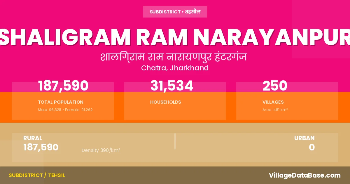 Shaligram Ram Narayanpur is a town and Subdivision in the Chatra district of the Jharkhand. In India, a Subdivision is a subdivision of a district responsible for the administration and revenue collection of a specific area within the district. Subdivisions play a crucial role in the local governance structure, contributing significantly to the development and administration of their communities.