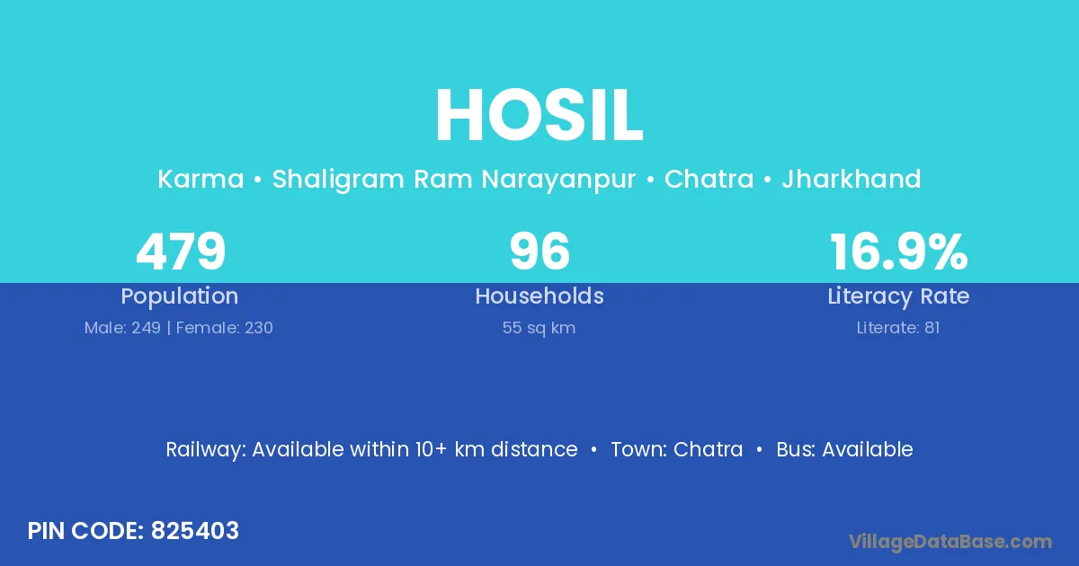Hosil village has a total population of 479 people, of which 249 are males and 230 are females.