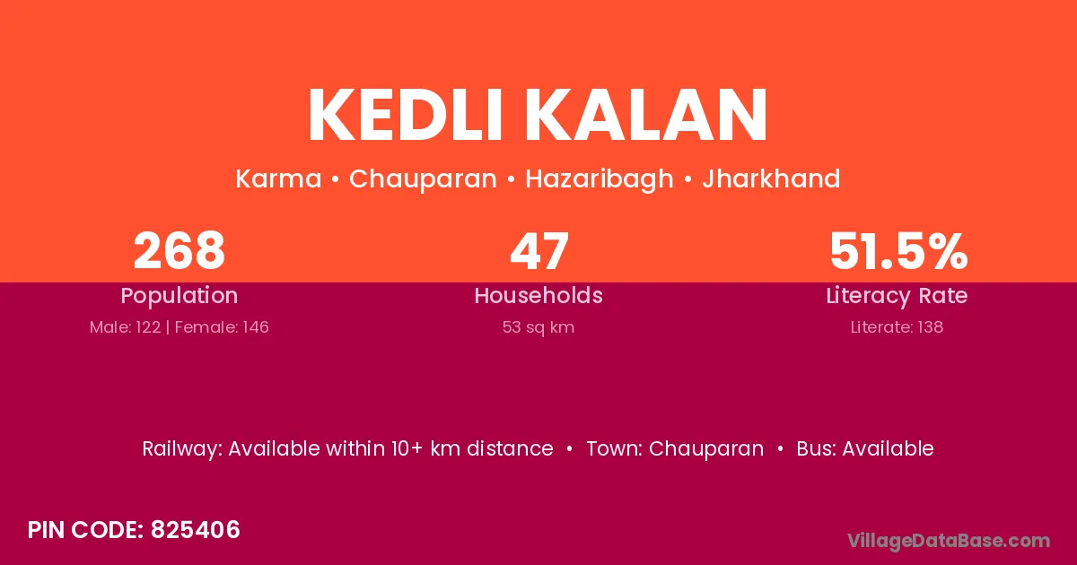 The literacy rate of Kedli Kalan village is 62.59%. Male literacy stands at 70.18% and female literacy at 54.76%.