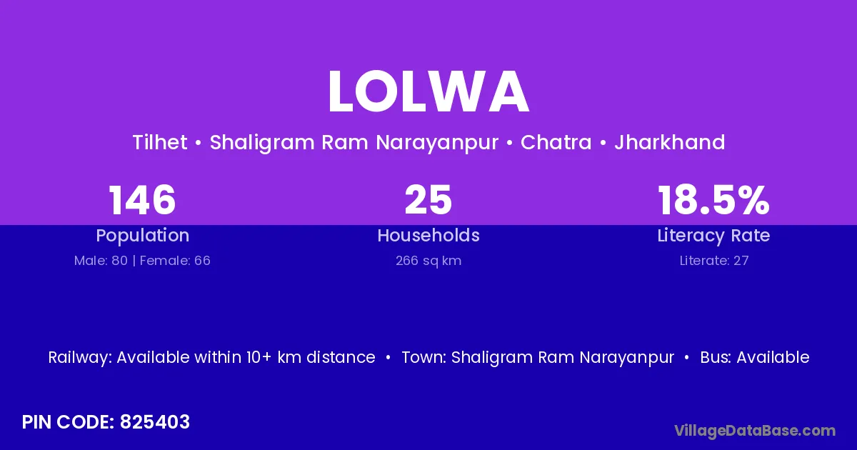 Lolwa village has a total population of 146 people, of which 80 are males and 66 are females.