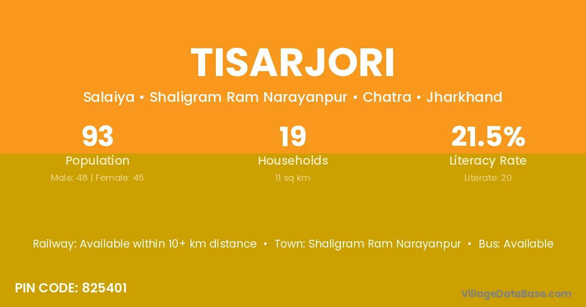 Tisarjori village has a total population of 93 people, of which 48 are males and 45 are females.