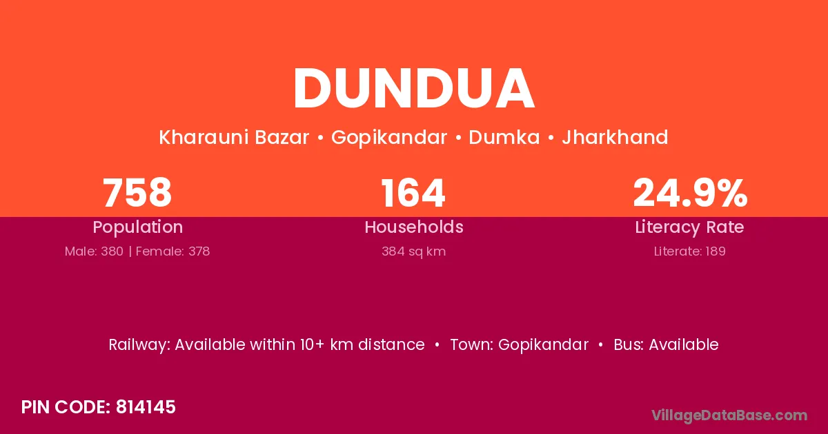 Dundua village has a total population of 1,660 people, of which 881 are males and 779 are females.