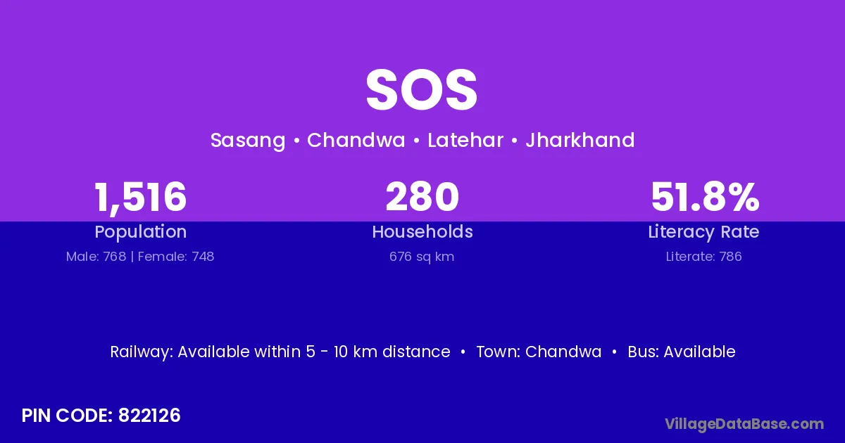 The literacy rate of Sos village is 45.04%. Male literacy stands at 52.63% and female literacy at 38.72%.