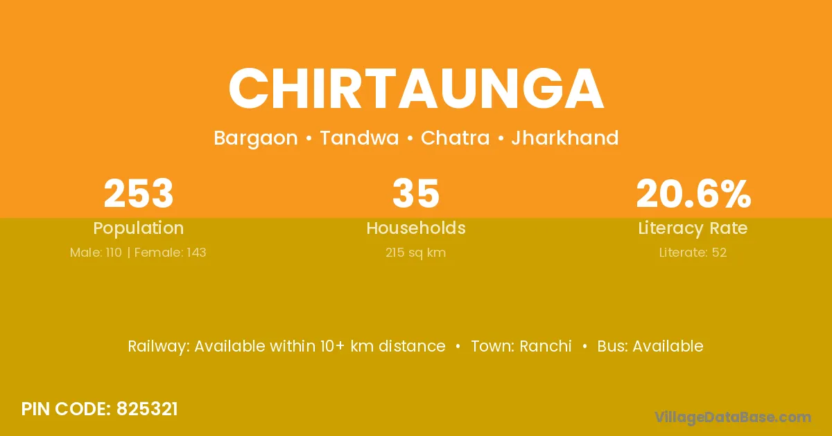 Chirtaunga village has a total population of 253 people, of which 110 are males and 143 are females.