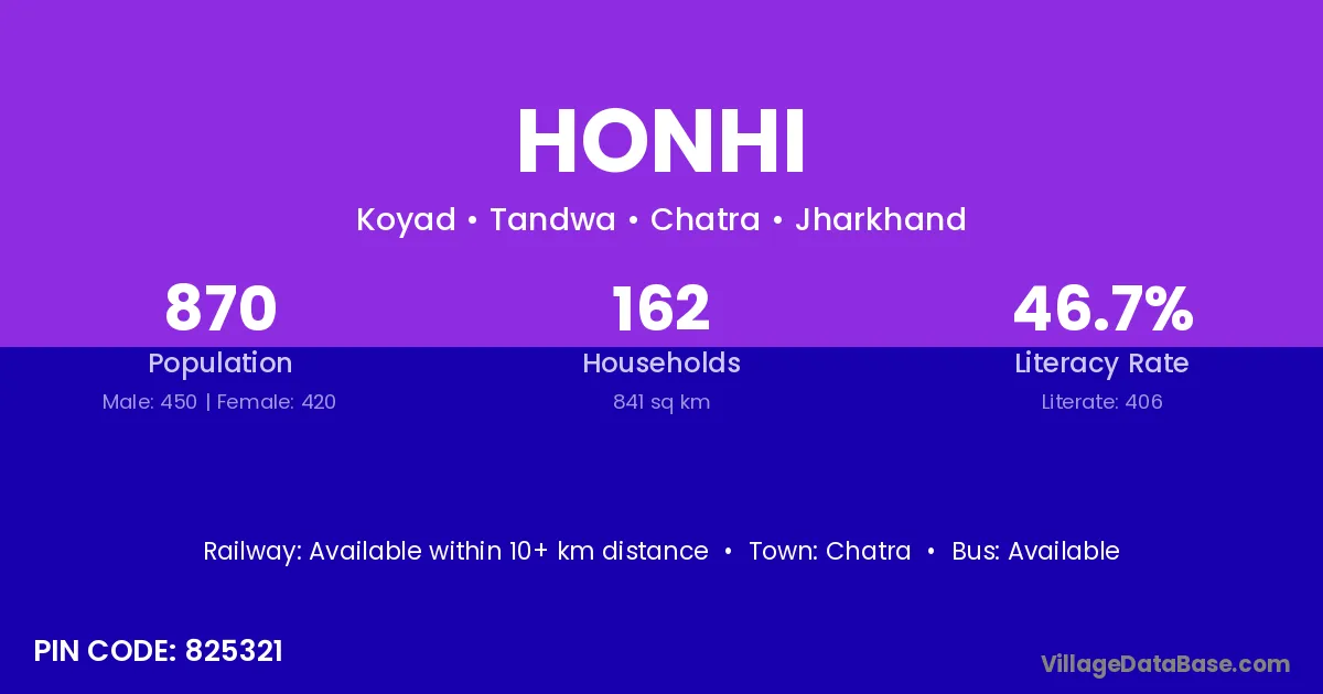 Honhi village has a total population of 870 people, of which 450 are males and 420 are females.