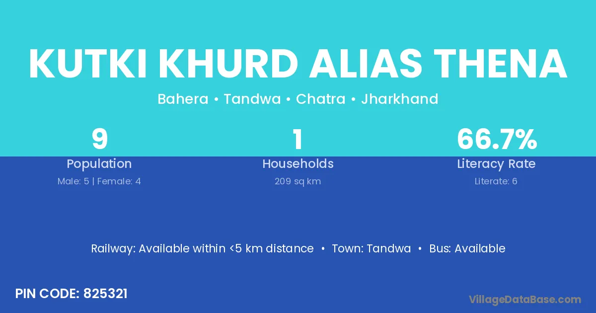 Kutki Khurd Alias Thena village has a total population of 9 people, of which 5 are males and 4 are females.