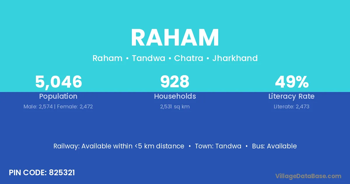 According to Census 2011 information, the village code of Raham village is 825321.