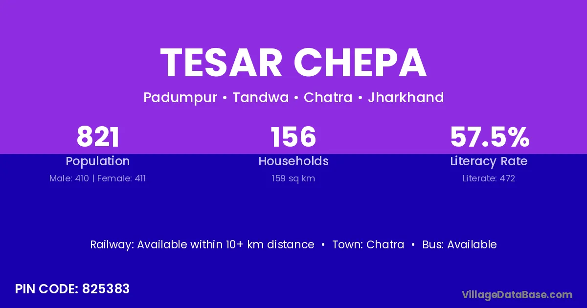 Tesar Chepa village has a total population of 821 people, of which 410 are males and 411 are females.