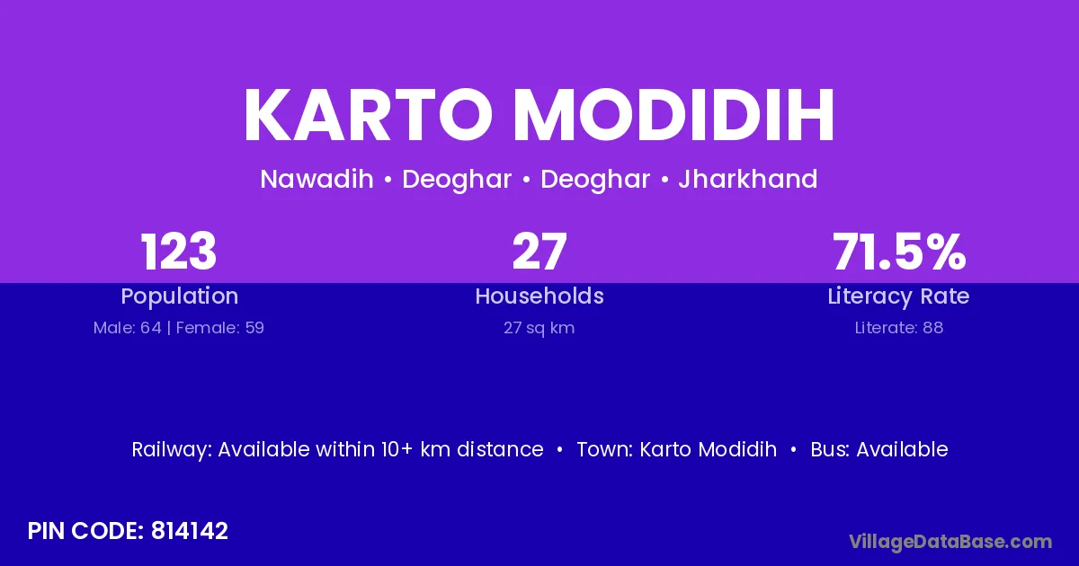 Karto Modidih village has a total population of 123 people, of which 64 are males and 59 are females.