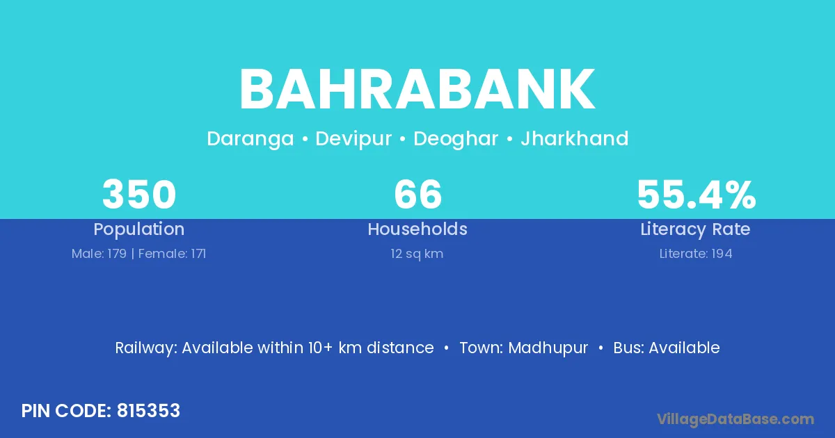 Bahrabank village has a total population of 350 people, of which 179 are males and 171 are females.