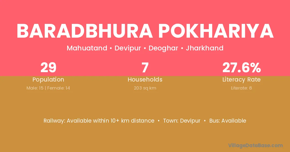 Baradbhura Pokhariya village has a total population of 29 people, of which 15 are males and 14 are females.