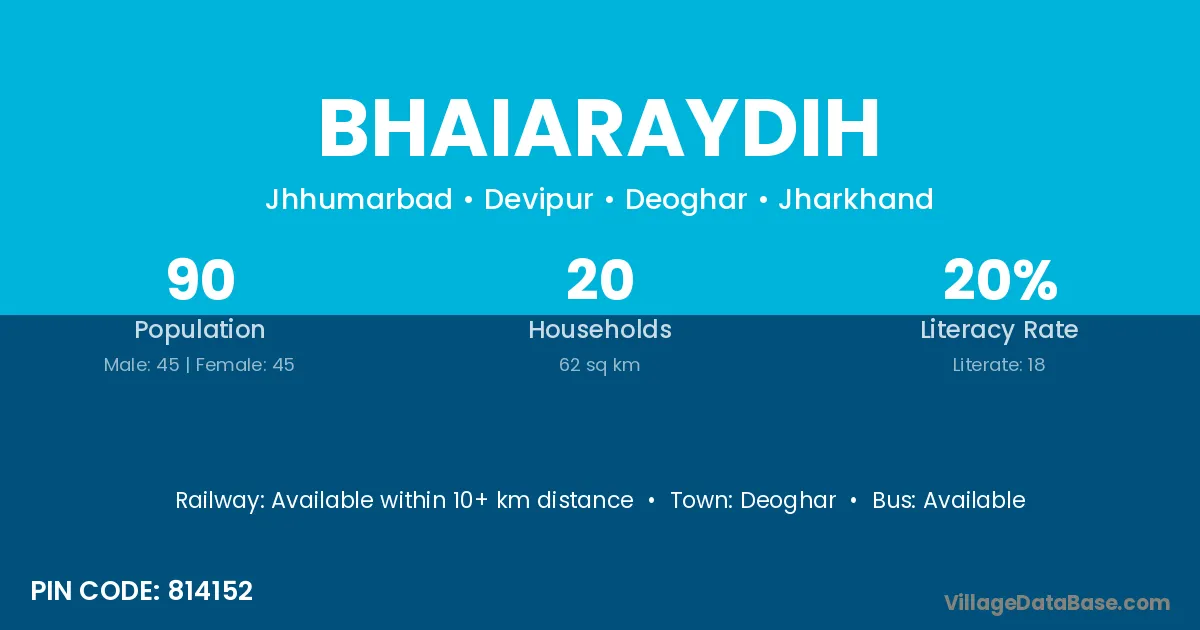Deoghar is the nearest town to Bhaiaraydih village for major economic activities