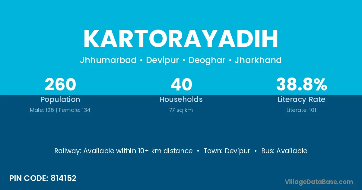 Kartorayadih village has a total population of 260 people, of which 126 are males and 134 are females.