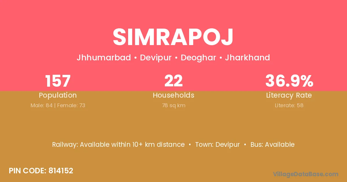 Simrapoj village has a total population of 157 people, of which 84 are males and 73 are females.