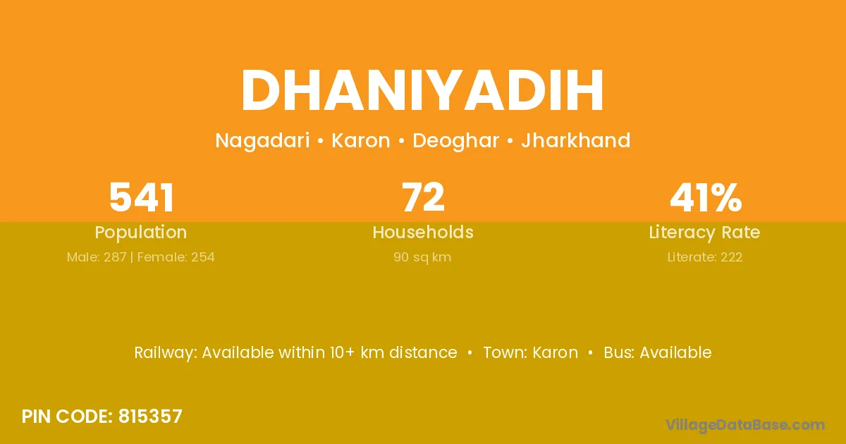 Dhaniyadih village has a total population of 541 people, of which 287 are males and 254 are females.