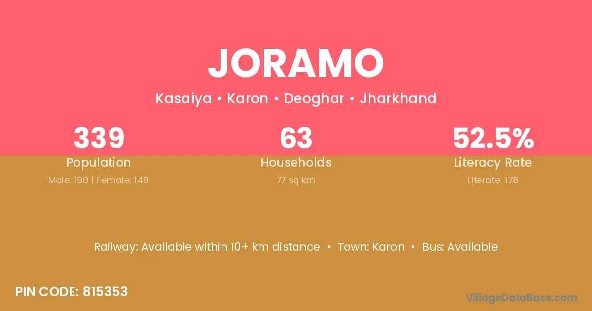 Joramo village has a total population of 339 people, of which 190 are males and 149 are females.