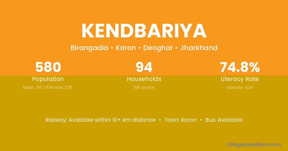 Kendbariya village has a total population of 580 people, of which 310 are males and 270 are females.
