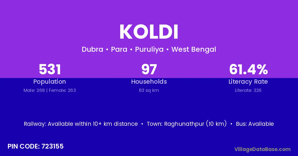 The literacy rate of Koldi village is 64.58%. Male literacy stands at 76.20% and female literacy at 50.18%.
