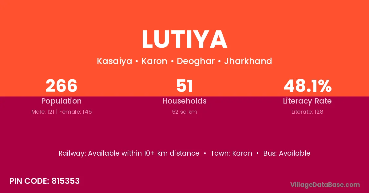 Lutiya village has a total population of 266 people, of which 121 are males and 145 are females.