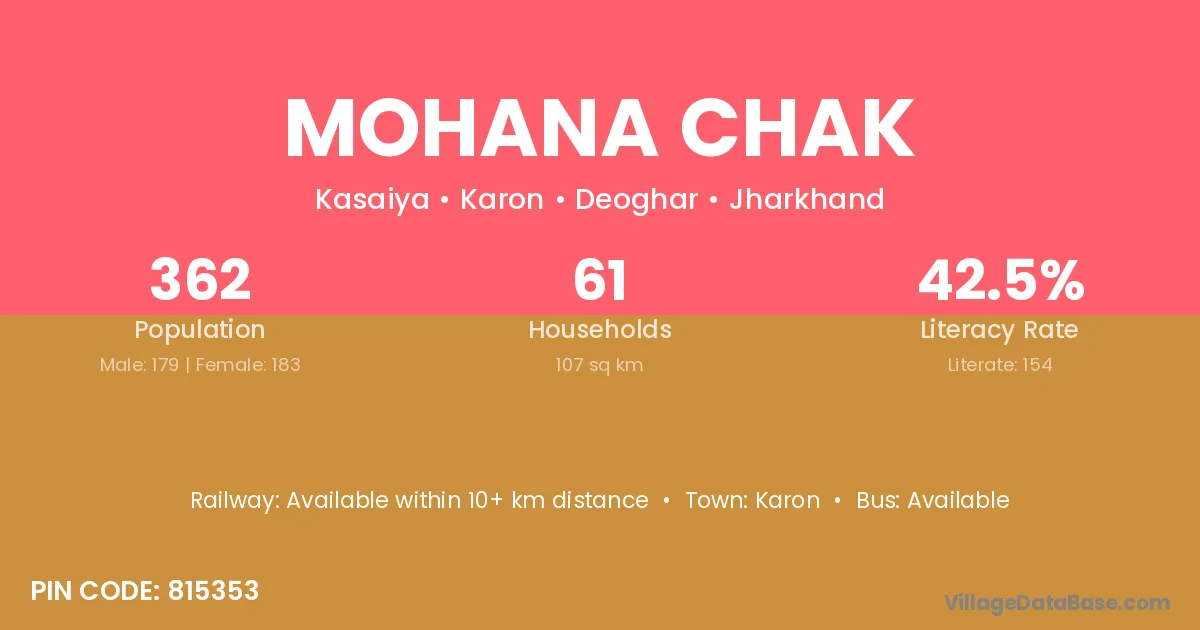 Mohana Chak village has a total population of 362 people, of which 179 are males and 183 are females.