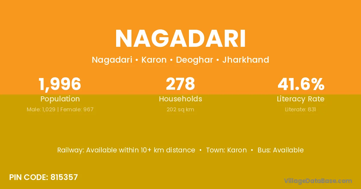 Nagadari village has a total population of 1,996 people, of which 1,029 are males and 967 are females.
