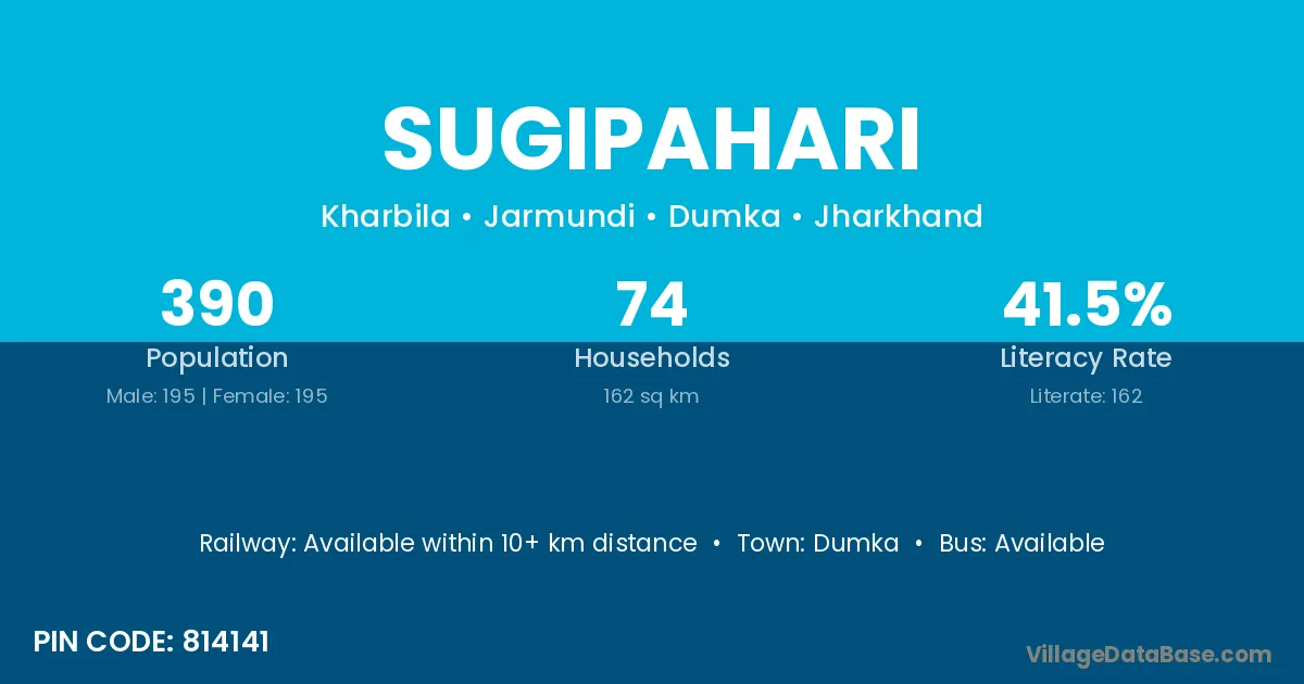 The literacy rate of Sugipahari village is 37.36%. Male literacy stands at 44.07% and female literacy at 30.99%.