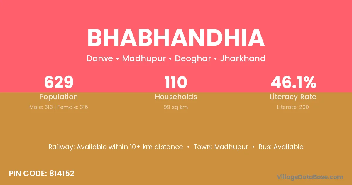 Bhabhandhia village has a total population of 629 people, of which 313 are males and 316 are females.