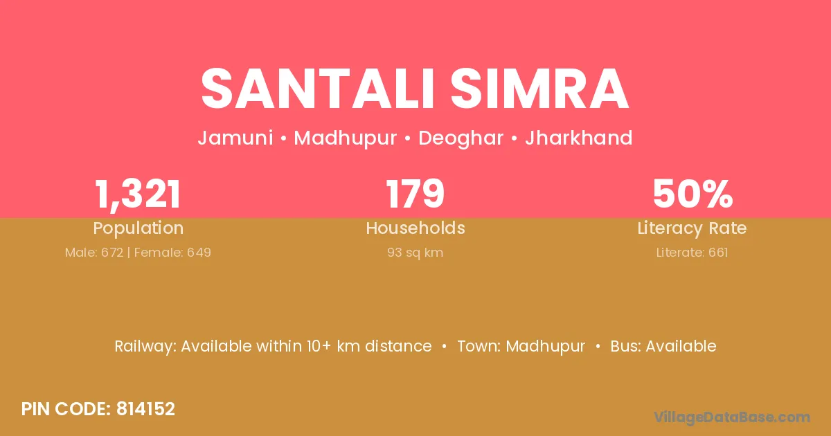 Santali Simra village has a total population of 1,321 people, of which 672 are males and 649 are females.